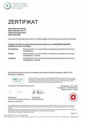 Durch das BIO SUISSE Zertifikat wird bestätigt, daß wir berechtigt sind, unsere dem Kontrollverfahren unterstellte Produkte mit Hinweisen auf den ökologischen Landbau zu kennzeichnen.
